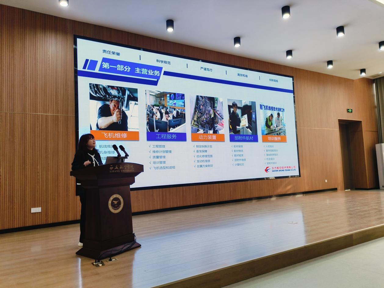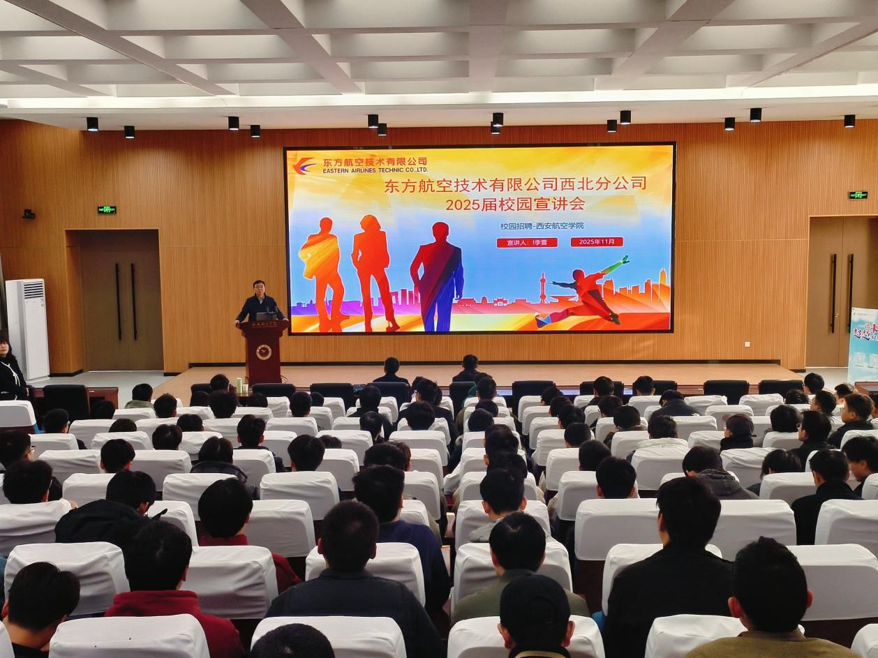 作为西北地区航空维修领域的领军企业,东航技术西安分公司是西安咸阳机场最大驻场单位,也是具备 A320 系列飞机全深度维修能力的核心机构,同时承担着 C919 国产大飞机 “沪陕快线” 的运行保障重任。宣讲会上,公司人力资源部负责人通过PPT 演示,全面介绍了公司发展历程、核心业务布局、企业文化及人才培养体系。重点解读了本次招聘的飞机维修工程师岗位需求,详细说明任职要求、薪酬福利及职业晋升路径,并特别强调公司为应届生打造的 “定制化培训计划”,涵盖 CCAR-147 部机型理论培训、模拟机实操训练等专业赋能环节,让在场学生对职业发展前景有了清晰认知。