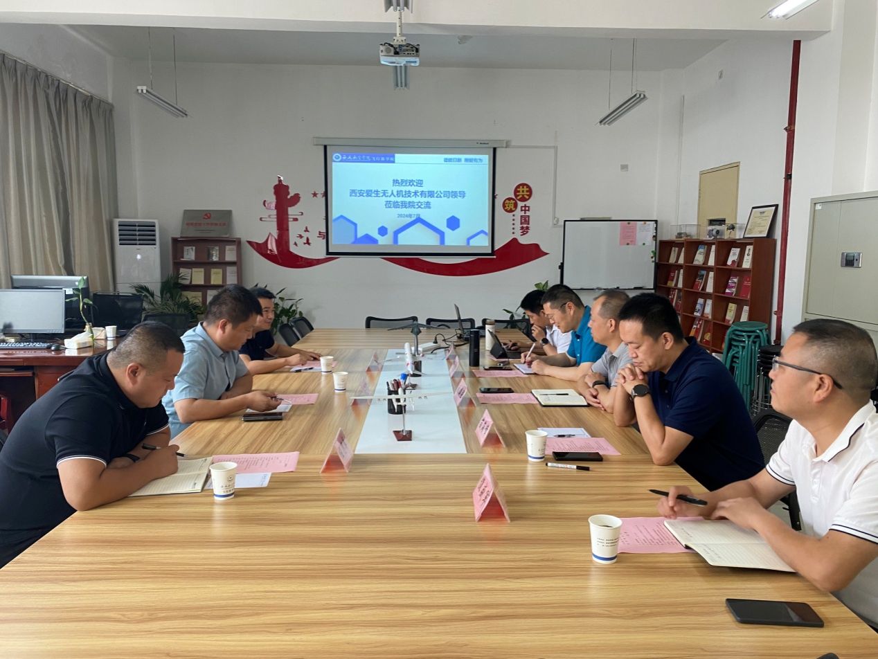 董彦非介绍了学院基本情况和专业建设情况。孙安建介绍西安爱生无人机技术有限公司的基本情况。李继广介绍了学院在无人机研发方面取得的成绩并展示了研发成果。