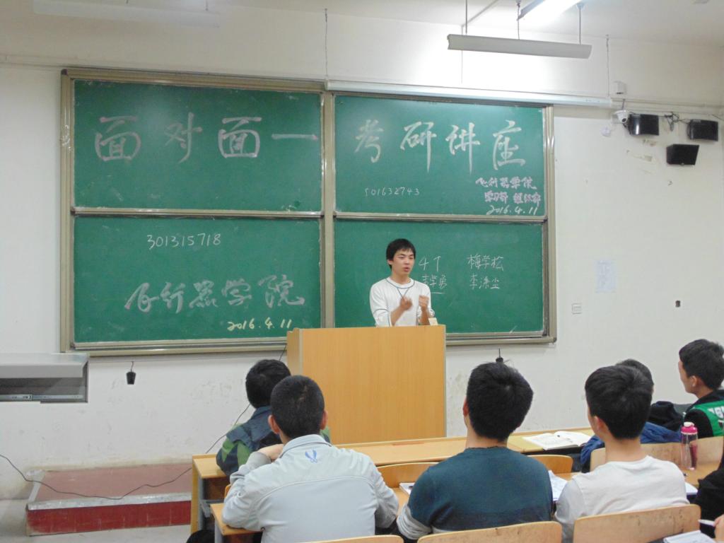 2016年4月11日晚7点,beat365中文登录入口学习部和组织部举办的“考研面对面”座谈会在阎教1136教室顺利开展。本次座谈会邀请到beat365中文登录入口已顺利考入知名院校研究生的王瑞豪、江凤祥、徐嘉怿和贺嘉诚四位大四学生,大二和大三有考研意向的同学们踊跃参加了讲座。