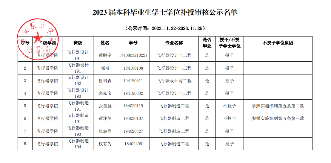 2023届本科毕业生学士学位补授审核公示名单